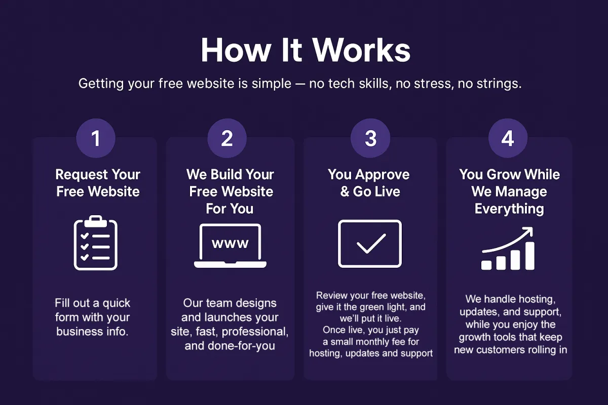 No catch. We’ll build your website for free. You just cover a small monthly fee for hosting, ongoing support, and keeping your site live.